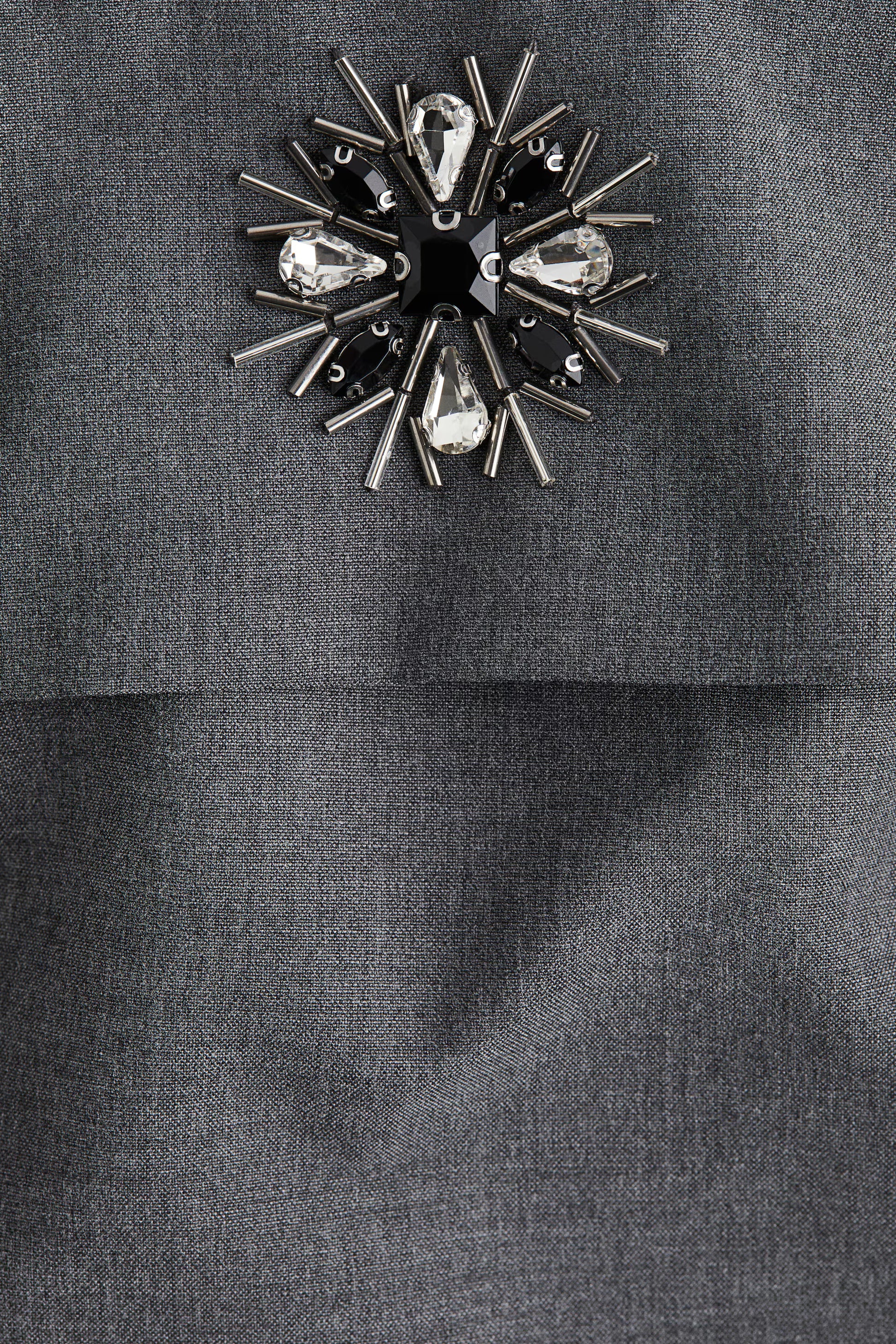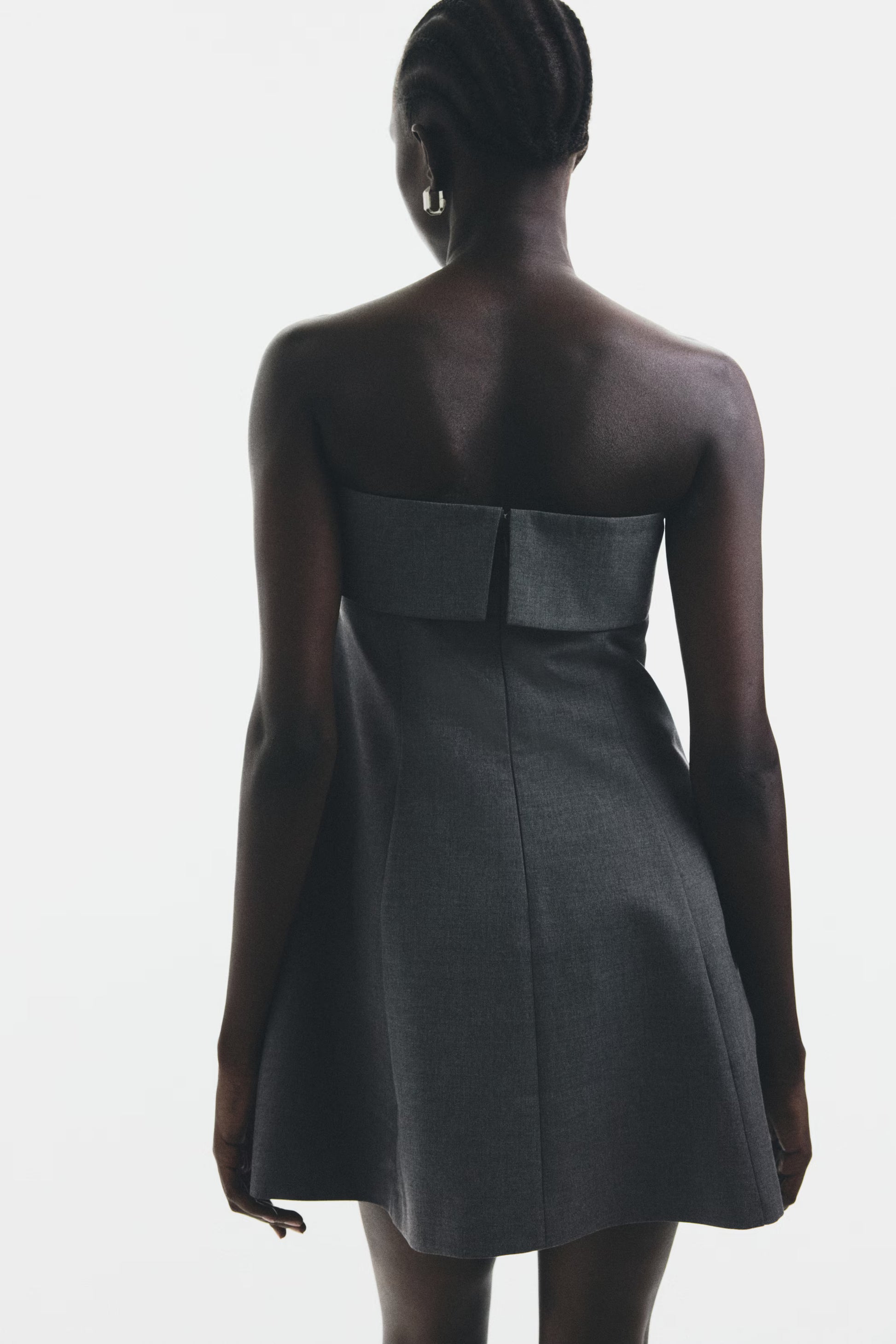 The design features finely pressed pleats that cascade from the neckline to the hem, adding texture, refinement, and a touch of classic couture. A chic, modern metal accent at the neckline gently gathers the fabric, creating a sculptural focal point that enhances the gown’s luxurious appeal.